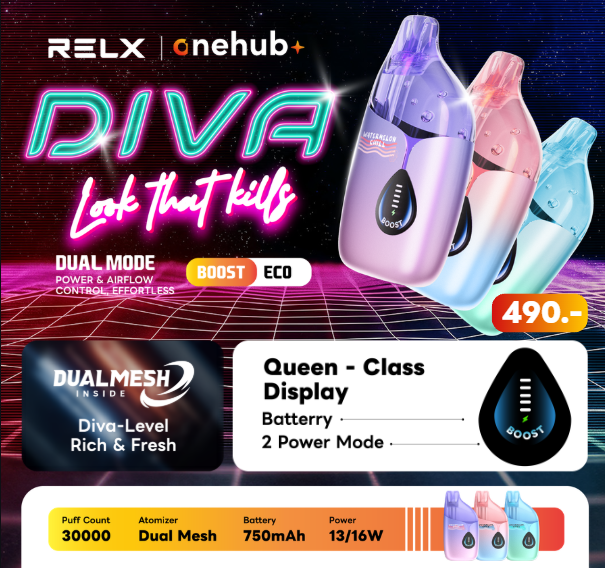 RELX Diva คือพอตใช้แล้วทิ้งรุ่นใหม่ที่ออกแบบมาเพื่อคนที่ต้องการทั้ง “ความแรง” และ “ความนุ่มนวล” ในเครื่องเดียว ด้วยเทคโนโลยี Dual Mesh Coil ให้ควันหนา กลิ่นชัดทุกคำ พร้อมโหมดปรับกำลังไฟได้ (Boost / Eco) ใช้งานง่าย ตอบโจทย์ทั้งสายสูบจัดและสายประหยัดแบต